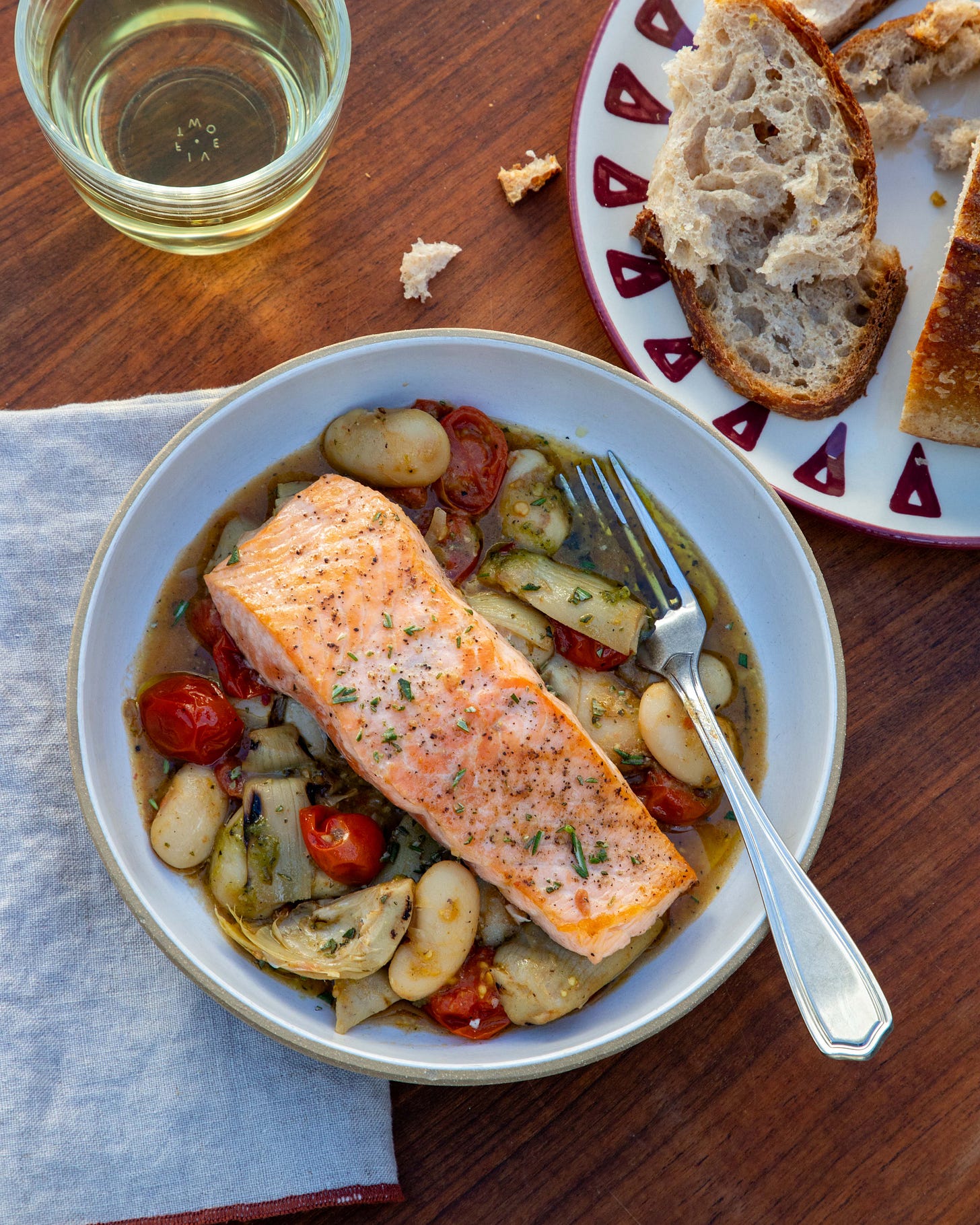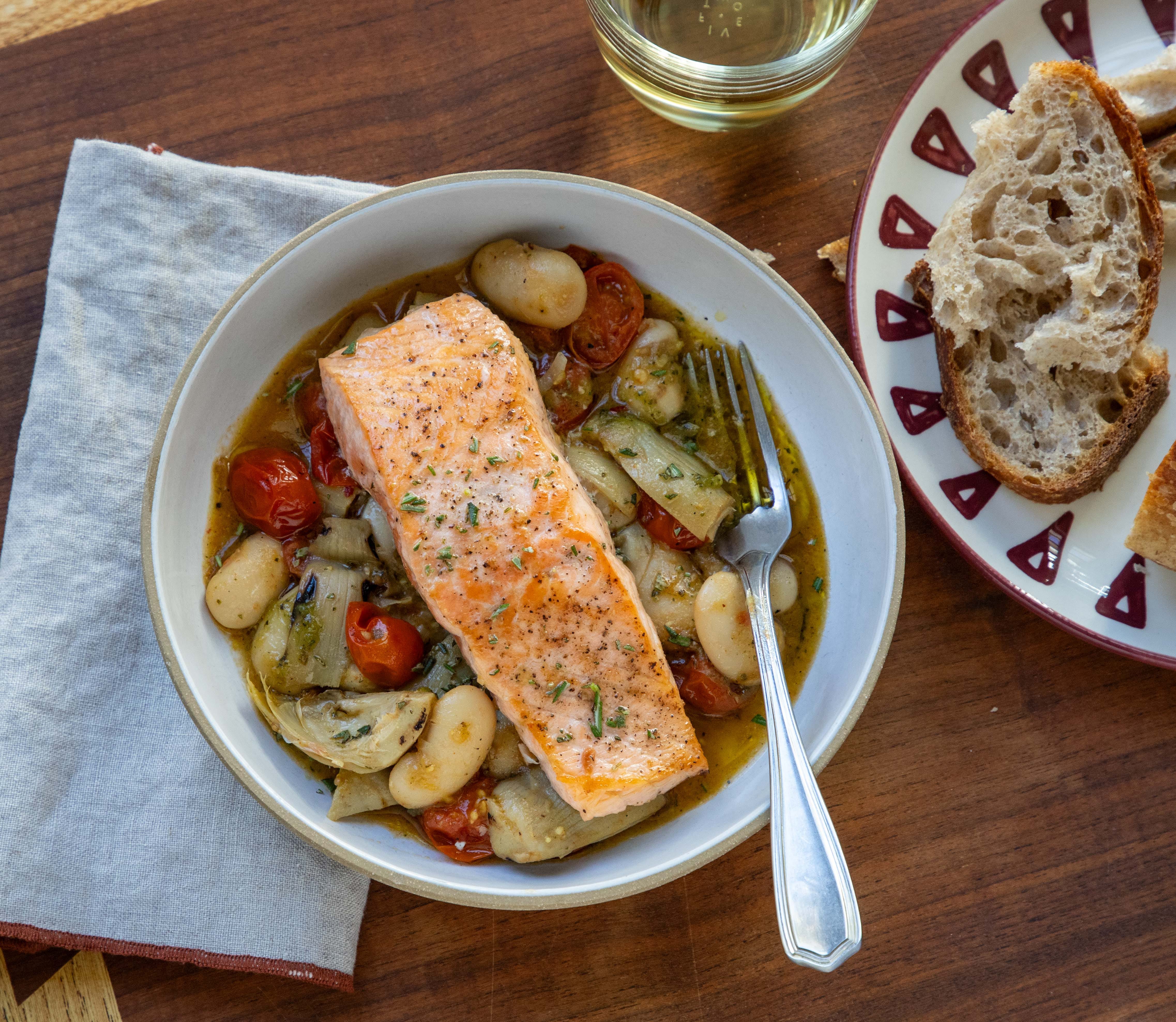 the recipe: Simple Salmon with Brothy Beans and Artichokes