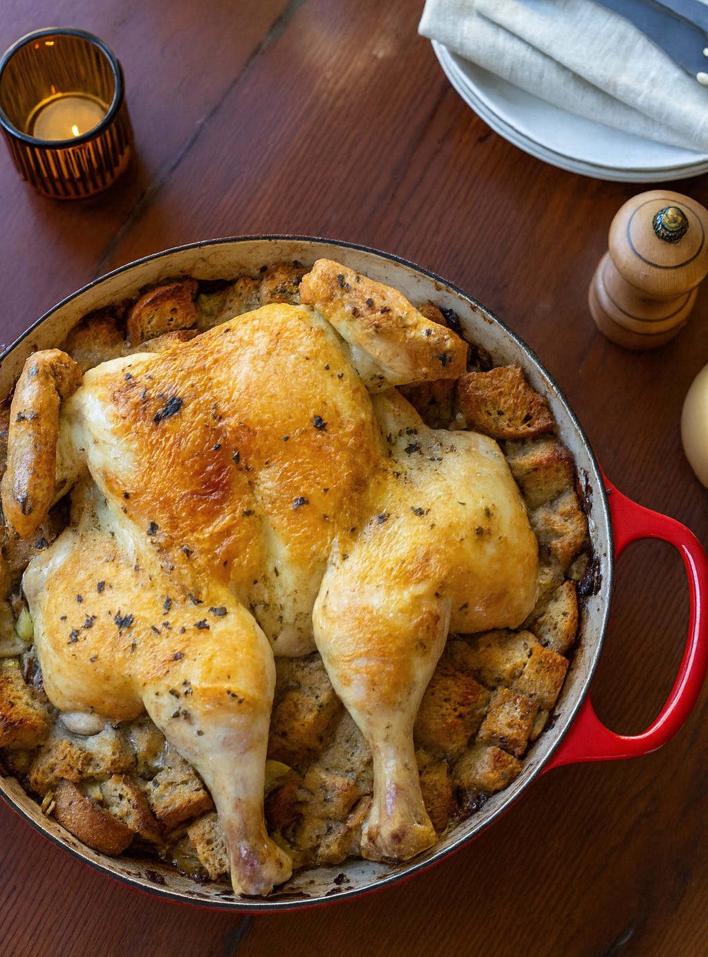 Once you learn the technique, I think you’ll turn to it often. One weeknight favorite that takes advantage of a spatchcocked bird is this one I wrote for Smithey: instead of stuffing, roasted potatoes and onions soak up all of those glorious pan drippings. I recommend you add it to your rotation.