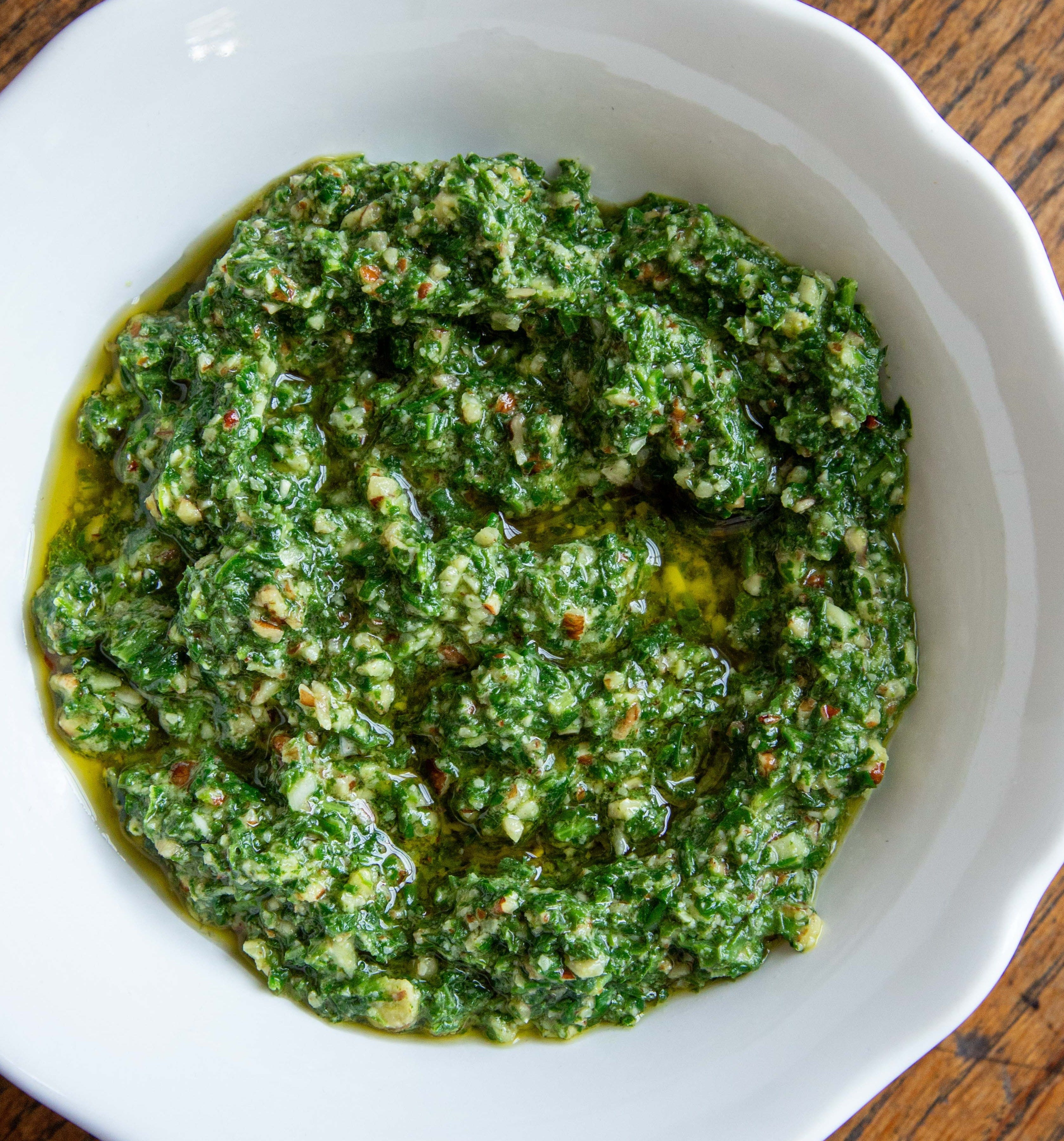Thanks to recipe work and photo shoots, I have scraps of extra greens and herbs in the fridge. To make the most of it, I threw together this quick pesto-like sauce that will make any boring chicken breast shine—or could be tossed with pasta, or served with eggs, or used to dress a rice bowl. It rescues odds and ends from the fridge (a la Make More with Less) and turns them into something genuinely useful.
